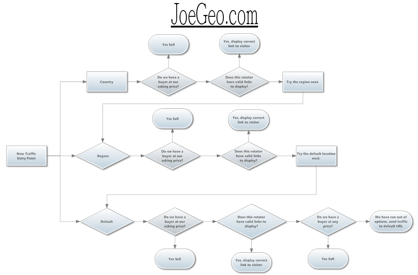 If you didn't have a rotator setup for the country or the region then it would first try and sell at the selling price set in your default settings, if no advertising campaigns can be found then it will go to your "Default" rotator. If your default rotator didn't contain any URL's or if the URL's had reached the limits set for them then it would try and sell the visitor at any price in the following order :- country, region, worldwide. If no buyers are found then your JoeGeo referral URL would be shown.